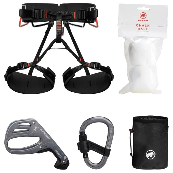 The 4 Slide & Smart Climbing Package from Mammut is the ideal climbing set for beginners. It includes a harness, belay device, carabiner, chalk bag and chalk.